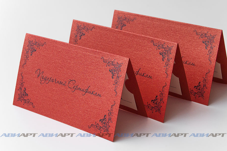 Подарочный сертификат из текстурной (дизайнерской) бумаги с вкладышем, биговка, высечкаПодарочныйсертификат из текстурной (дизайнерской) бумаги с вкладышем, биговка, высечкаБуклет-приглашение А4 из текстурной (дизайнерской) бумаги с полноцветной печатью, биговкаРазворот папки 660х297мм, биговка, высечка